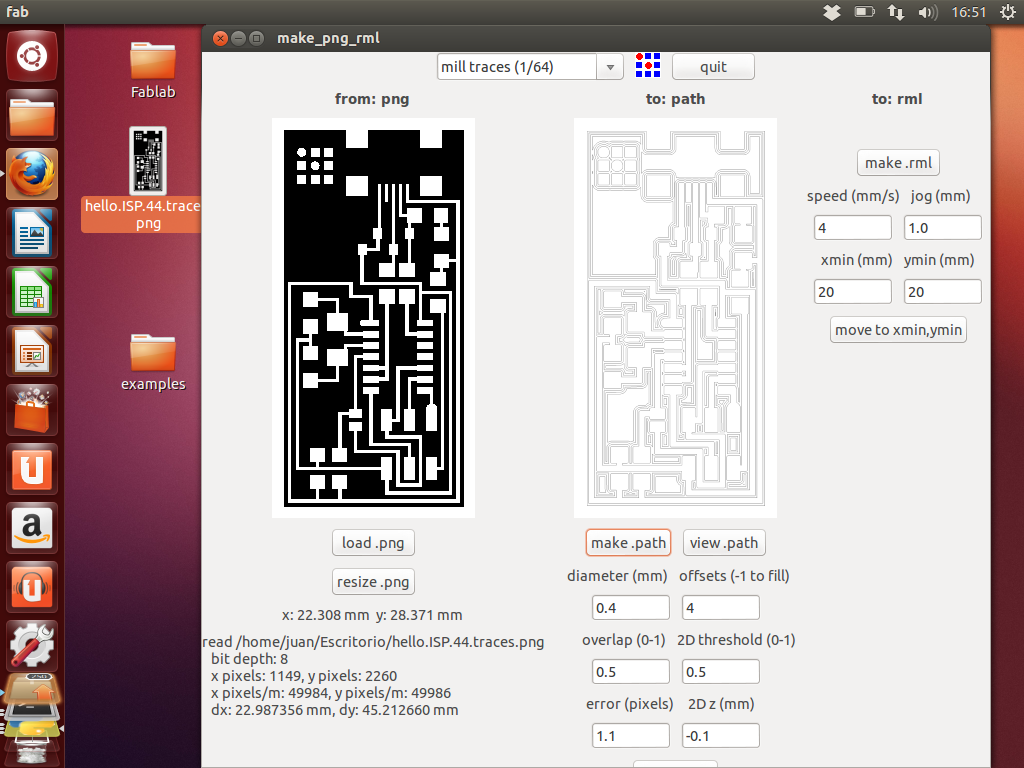 The first thing I did was read the tutorials "How to Assemble and Program the FabISP" and "How to make circuits on the Modela milling machine (fab modules)" .Then I downloaded the proposed designs on the website as "hello.ISP.44": interior.png , traces.png and board . I started the "Fabmodules" to set up printing with the milling machine "Modela".