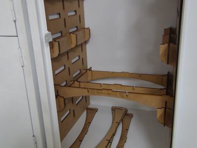 I started putting 2 walls (brown parts in the left picture) to support the rack's structure. The locker sides will support this walls (without glue or other kind of joint element). Also the racks could be put in any height.