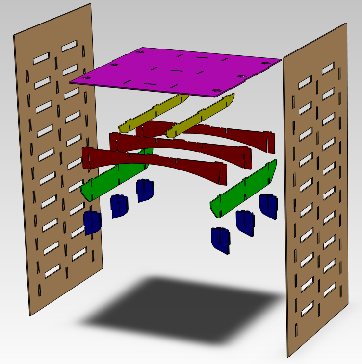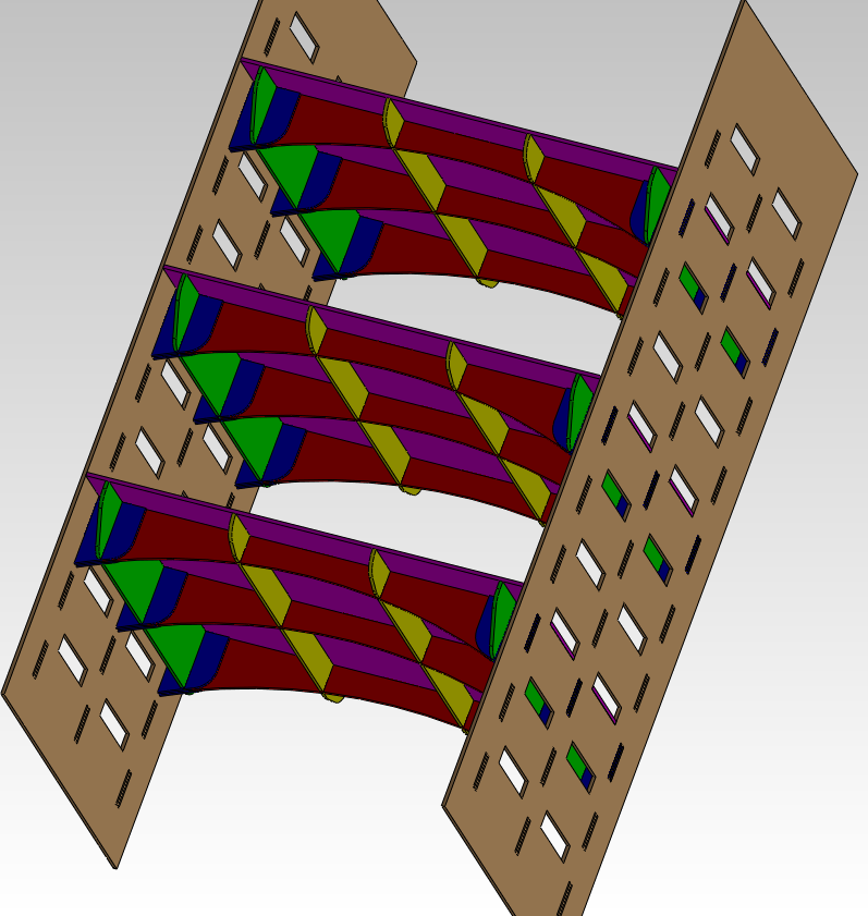 Each rack, use 3 beams (red) that will been supported by 6 tabs (blue) to each wall of the shelf (total 12 tabs by rack), this tabs needs a tab-connector (green) to coupling to the beam.