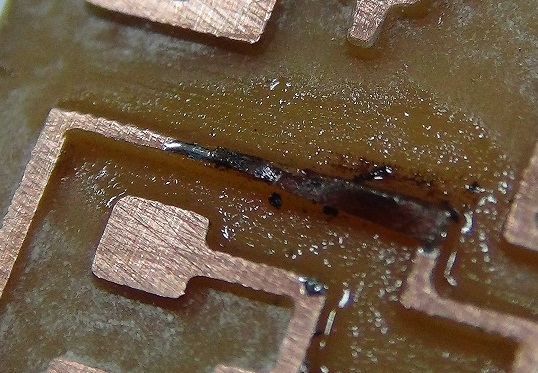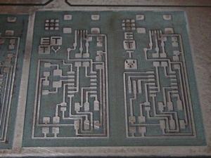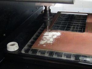 Milling the Circuit with the Modela MDX-20 using our Mill Adaptor and not standar mill bits (conical bit). In our case normally need to use sandpaper to eliminate the mill burr on the copper surface.