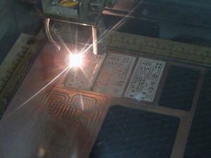 The board cutting we did with the laser cutter, it was easy and faster than the milling process. The copper layer on the cutting path was removed before this process. The parameters was Power = 100%, Speed = 50%, Frecuency = 5000Hz