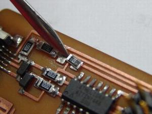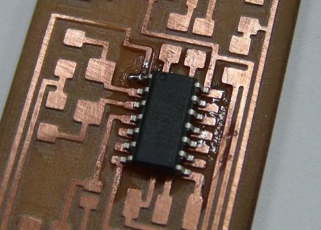 For place the Attiny44, tinned one leg of the microchipand the corresponding pad before welding it, this make easy the correct placement of this important component.