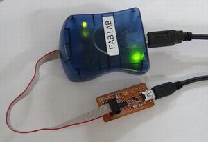 Connect the AVRISP2 programer to the pinhead of the FabISP board and the microUSB port to the computer USB-port. If all is correct the AVRISP2 LED light will be green.