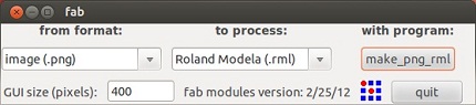 The Fab Tools window will appear. Pic [Image(.png)] in format popup and [Roland Modela(.rml)] in process popup, and click