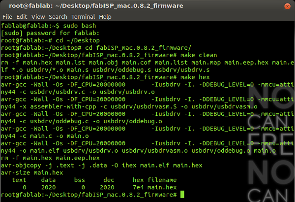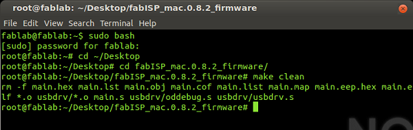 root@fablab:~/Desktop/fabISP_mac.0.8.2_firmware# make cleanAll was correct and the window looks like this:
