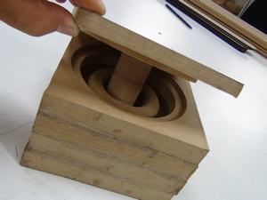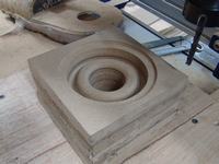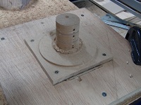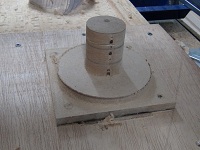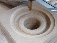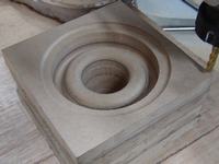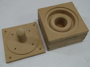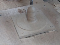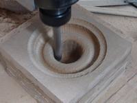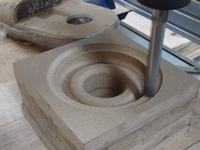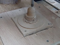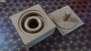 | Step 04.-To fix the other part of the mold screw the MDF more than normal (introduce the head of the screw inside the MDF). For this part I use ¼" Flat Point end mill with long shaft and PartWorks to create a pocket around the cilinder to create a gross profile for the 3D milling process. |