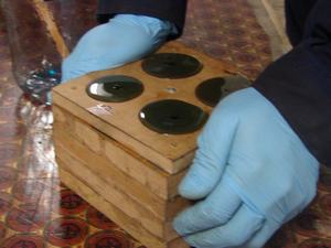 | Step 02.-Screw the block of cavity mold to a piece of board. Take care and screw where the mill wouldn't pass inside de mold cavity. Then screw the piece of board on the Shopbot bed. |