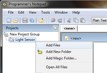 Step 02.- Open the Programmers Notepad[WinAVR] and create a new project write the name of your proyect in the |