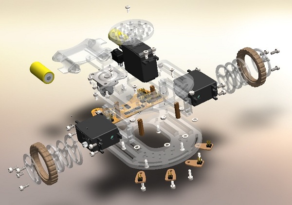 All the parts are modeled 3D in CAD, included the electronic boards, bolts, servomotors, caster wheel, batteries, etc. The image and the video show the exploded view of the assembly. The CAD files can be download here.