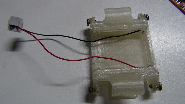 All the structure was 3D printed. The screws are for make electric contact. The cables are internal routing to made a battery pack with 7.4V (3.7V+3.7V). Also the fixation is with mechanical block using the screws of the caster wheel.