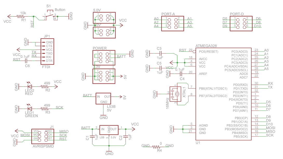 The board is an Arduino UNO modified to fit the robot structure (Eagle files). So I used a ATmega328P and a 16MHz resonator. This allow to burn the bootloader like a normal Arduino UNO. Also included an independent power supply (5V-1A) for the servo motors and other for the microcontroller.