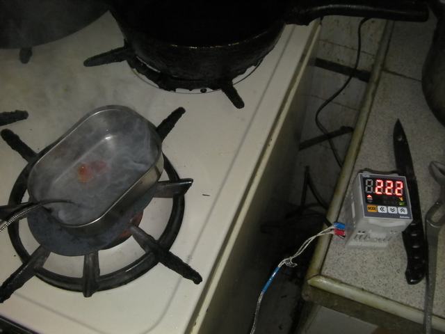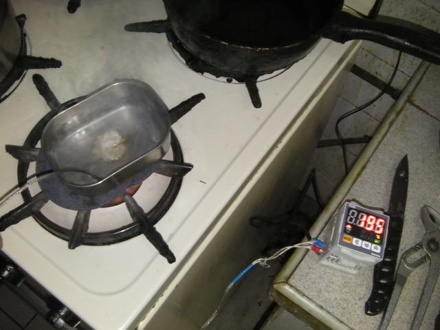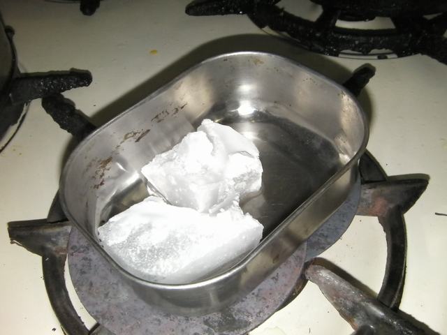 | 3. Melt down the paraffin inside a metal resipient. I put over the oven covered with copper layer to distribute the heat (If you prepare more you don't need these copper layers) | ![]() |