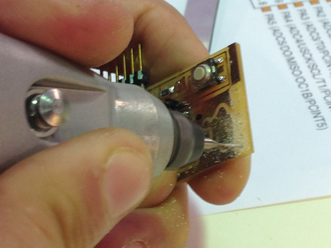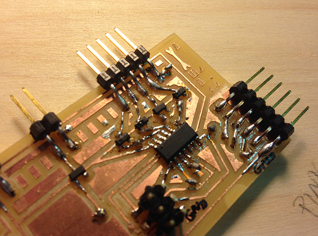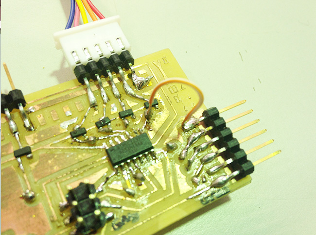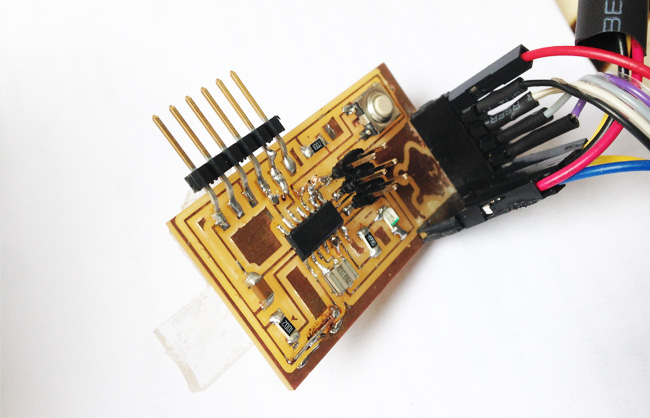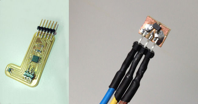 i thought about using the board i designed for the input devices ' assignement, but ultimately i just made a macgyver-style pcb with the sensor, due to problems with the dremel we use in the Modela.