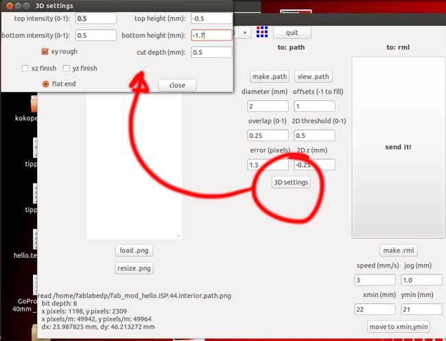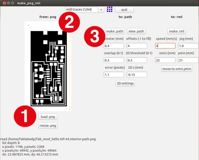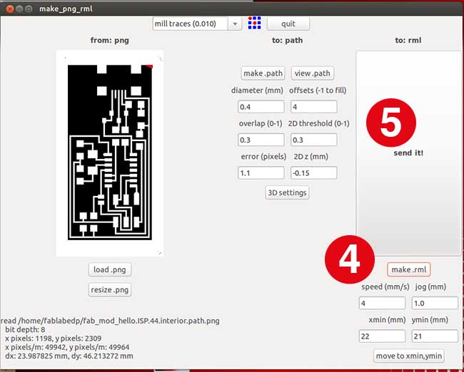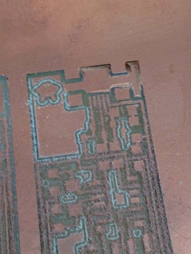 These settings needed some tunning, since at the top of the board it didn't milled deep enough. This happened not because of lack of precision of the Modela, but because the board wasn´t completely flat (and every micrometer counts)