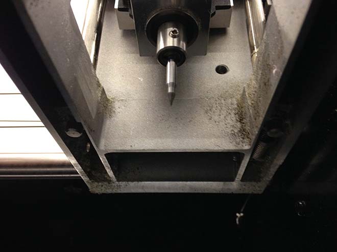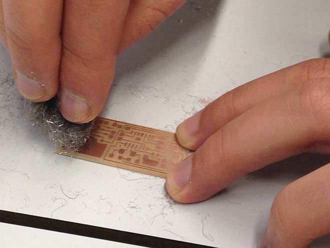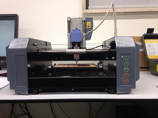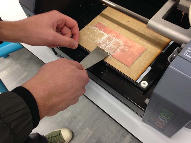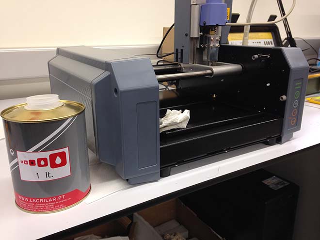 We started by cleaning our Modela with acetone and paper tissue. It's very important to keep things tidy and clean around the lab, but most important it avoids dirt to deposit around the milling area of the machine, wich can lead to misalignements in the z axis and ultimately it can destroy your PCB.