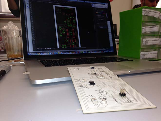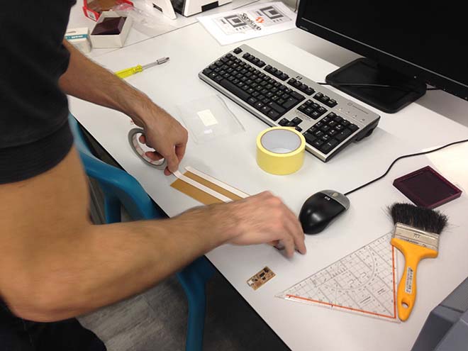 We picked the components from the storage unit using a laser-printed card with a scaled circuit and attached them ther with double-sided adhesive .