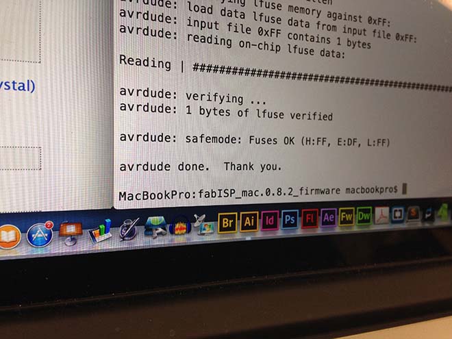 - download and install the firmware for the microcontroller (you can download it here FabISP Firmware for MacOS 10.8.2