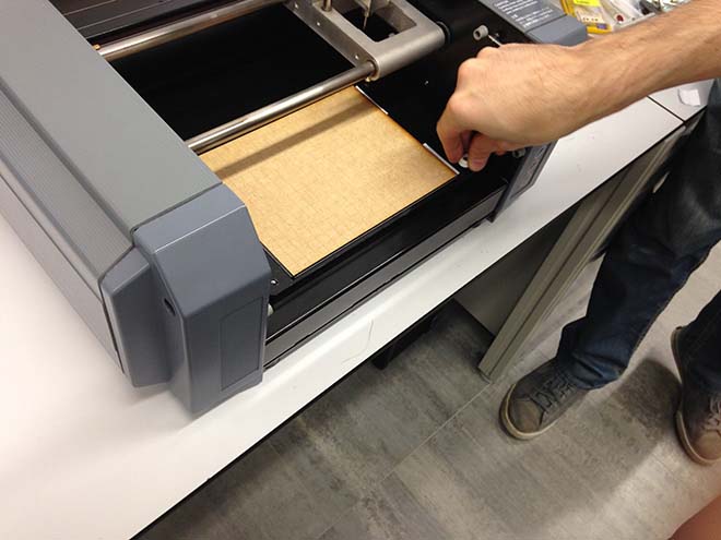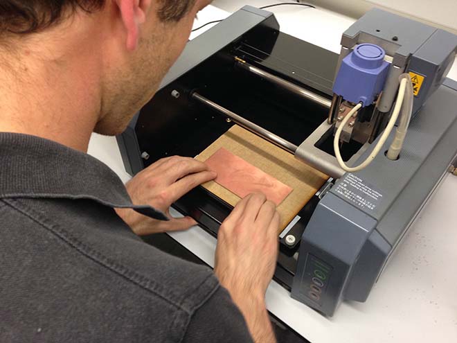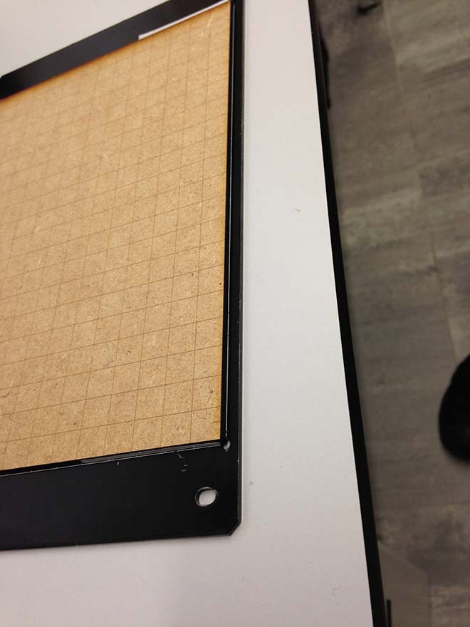 It was now time to install the sacrifice board. it's a piece of wood, cut in the laser cutter that is glued to the Modela working area, and it works as a protection for the machine, in case the mill starts to go lower on the z axis than it should. Like all things in precision milling, it needs to be completely flat. A difference in micrometers can ruin your board.
