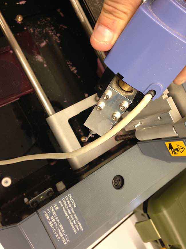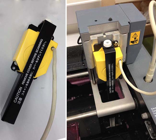 I started by changing the heads. the one that was in the machine was the milling head (blue color), and i had to install the scanning head (yellow colour). Important note: don´t remove the protection of the scanning needle before it's fully mounted in the modela, otherwise you might damage this very sensible part of the machine.