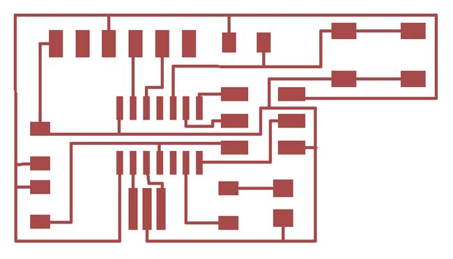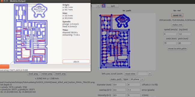 After correcting the errors found through ERC (tools/ERC) in Eagle, i exported the final drwaing as a MONOCHROME png, to be opened by Fabmodules into the Modela, for milling and cutting.