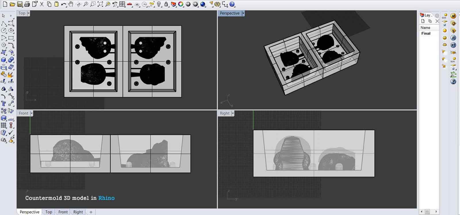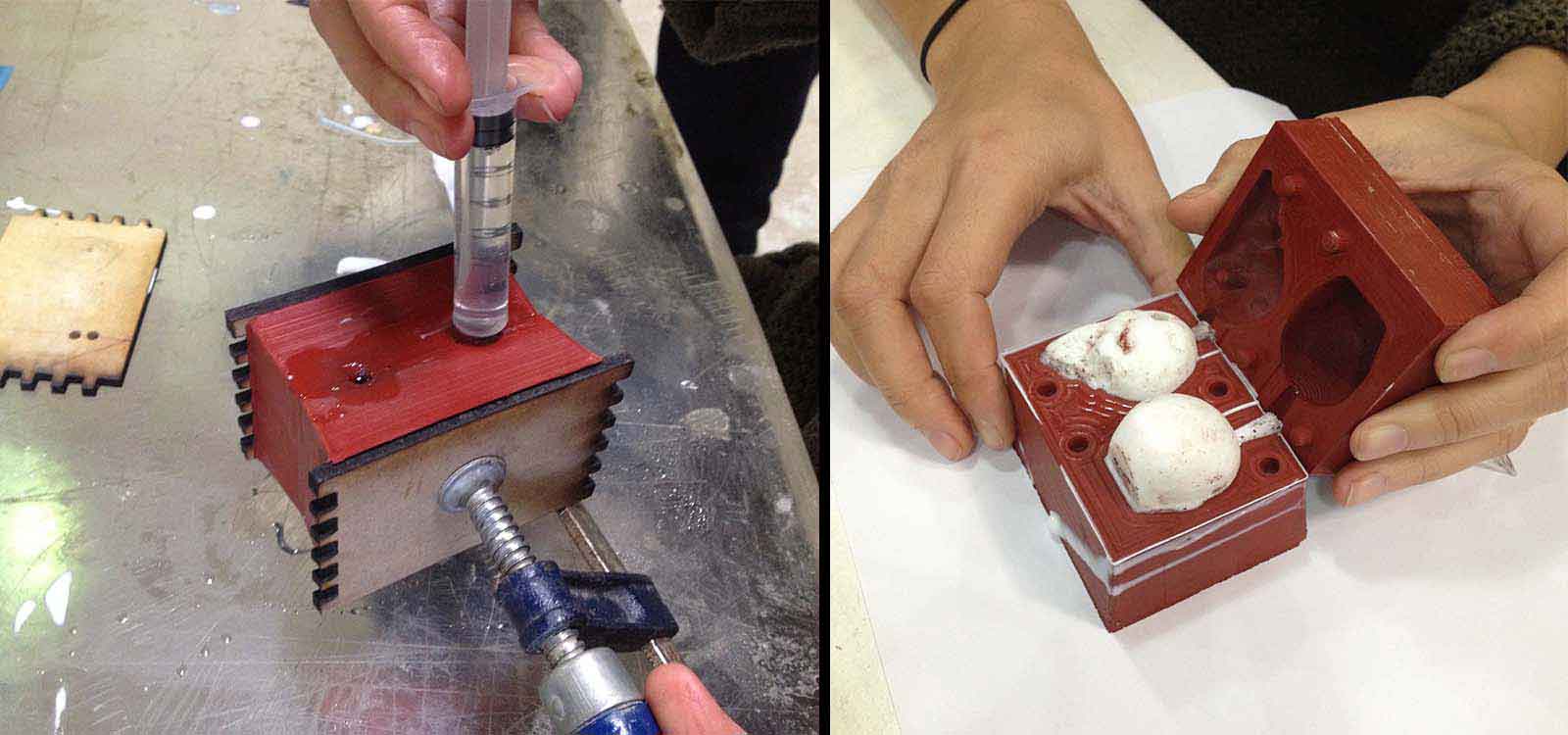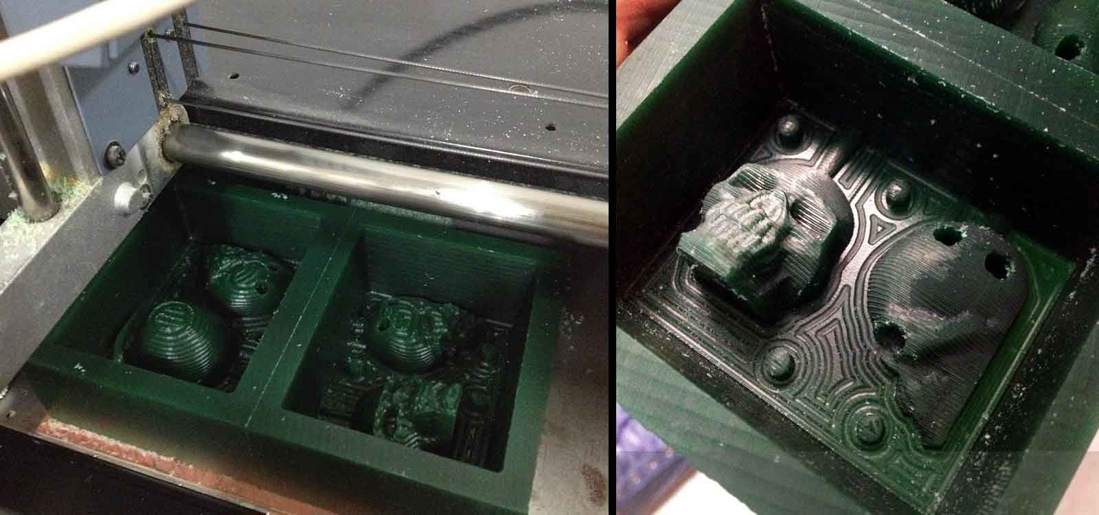 This week we had to design a piece that we could replicate by making its mold. I decided to download a model from Thingiverse and personalize it in Rhinoceros. I wanted to try hard materials [like metal and plastic] for the final piece, so the mold had to be soft. We made the wax countermold in the Roland Modela Milling Machine and then we used heat resistant silicone for the mold.