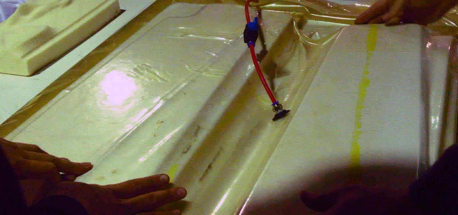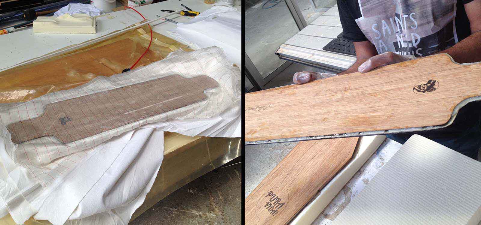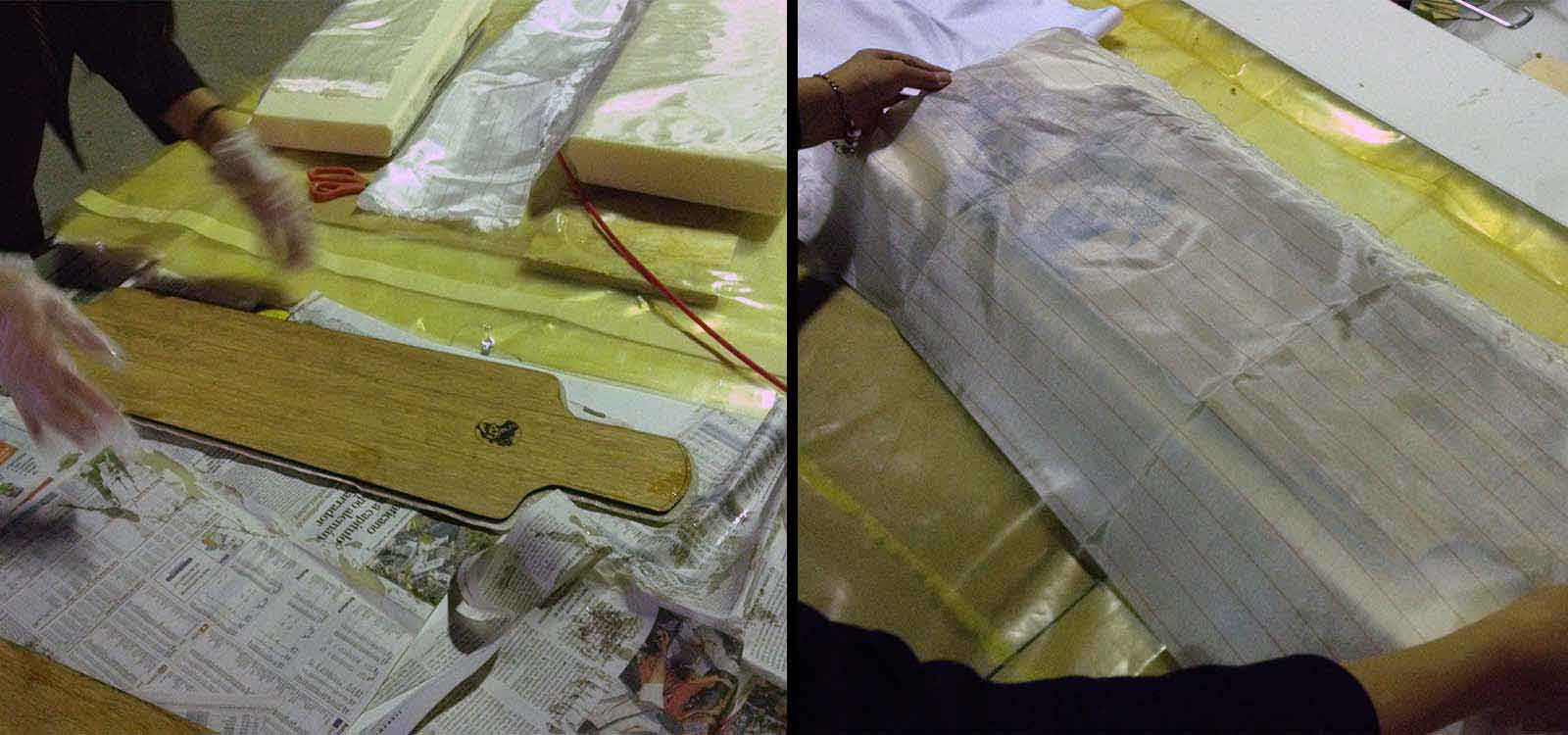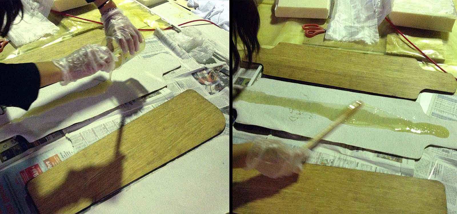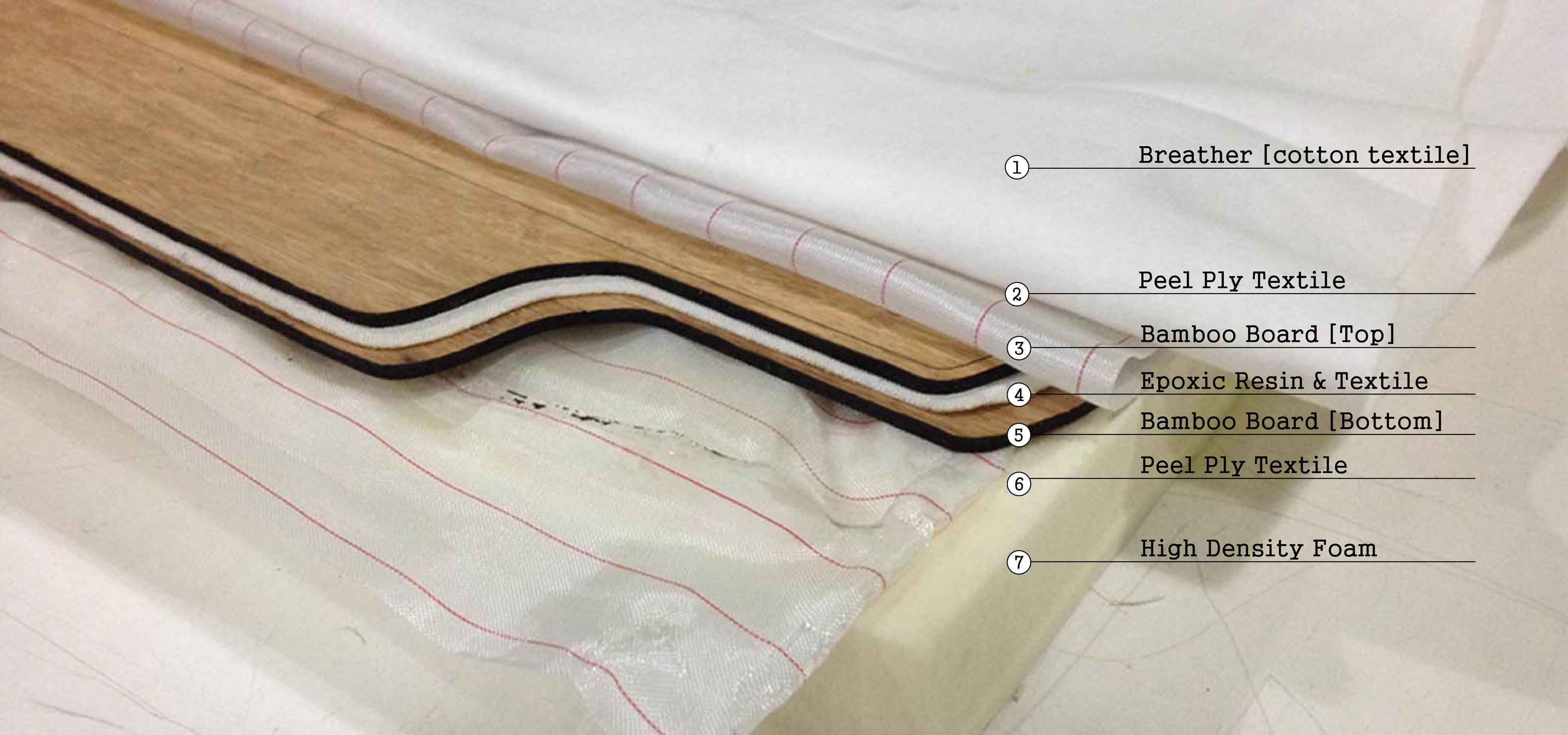 The High Sensity Foam is shaped with the final curvature and it is strong enough to compress; the Peel Ply is strong enough to pull out so we can remove the skateboard that is going to be stick to the foam mold with the resin; the Breather allows all the air to be absorbed by the compressor, avoiding air bubbles and finalle the Epoxic Resin strenghen the skateboard and keeps the two bamboo layers together.