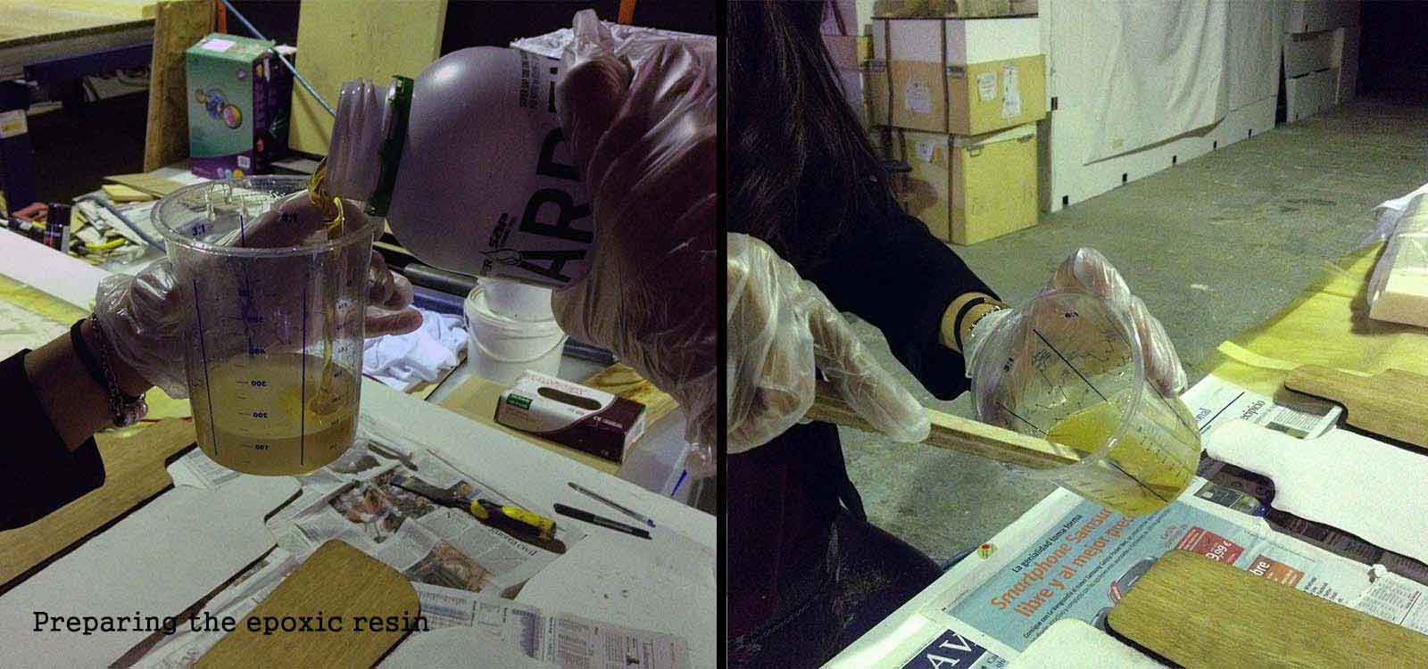 Once you have all the materials cut and ready, it is time to make the mix for the epoxin resin. The proportion is 2:1 that in our case corresponds to 100 ml Part A and 50ml Part B . You mix it for 3 minutes and spread it on the textile making sure it covers the entire surface.