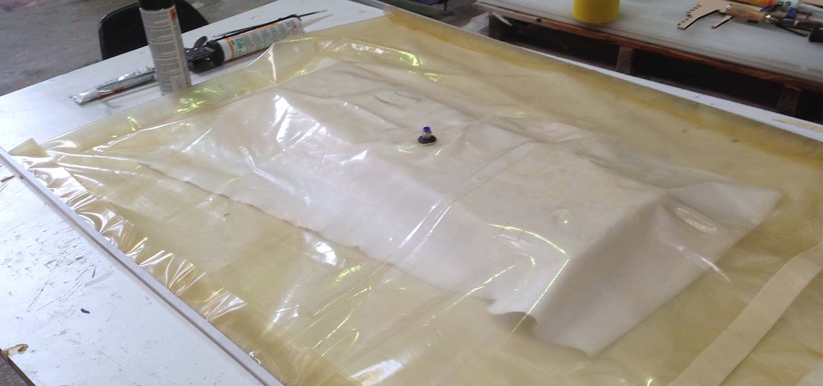 The following step is to put all the layers together and place them inside the bag. You have to make sure that the breather is not under the mold and it covers the whole surface . You also need to be careful so the layers don't move while putting them inside. Also, I need to place a piece of thick wood under the mold so it didn't bend during the compressing process. After this, you close the bag and turn the compressor on. The vacuum bag process for bending the bamboo takes 6 hours .