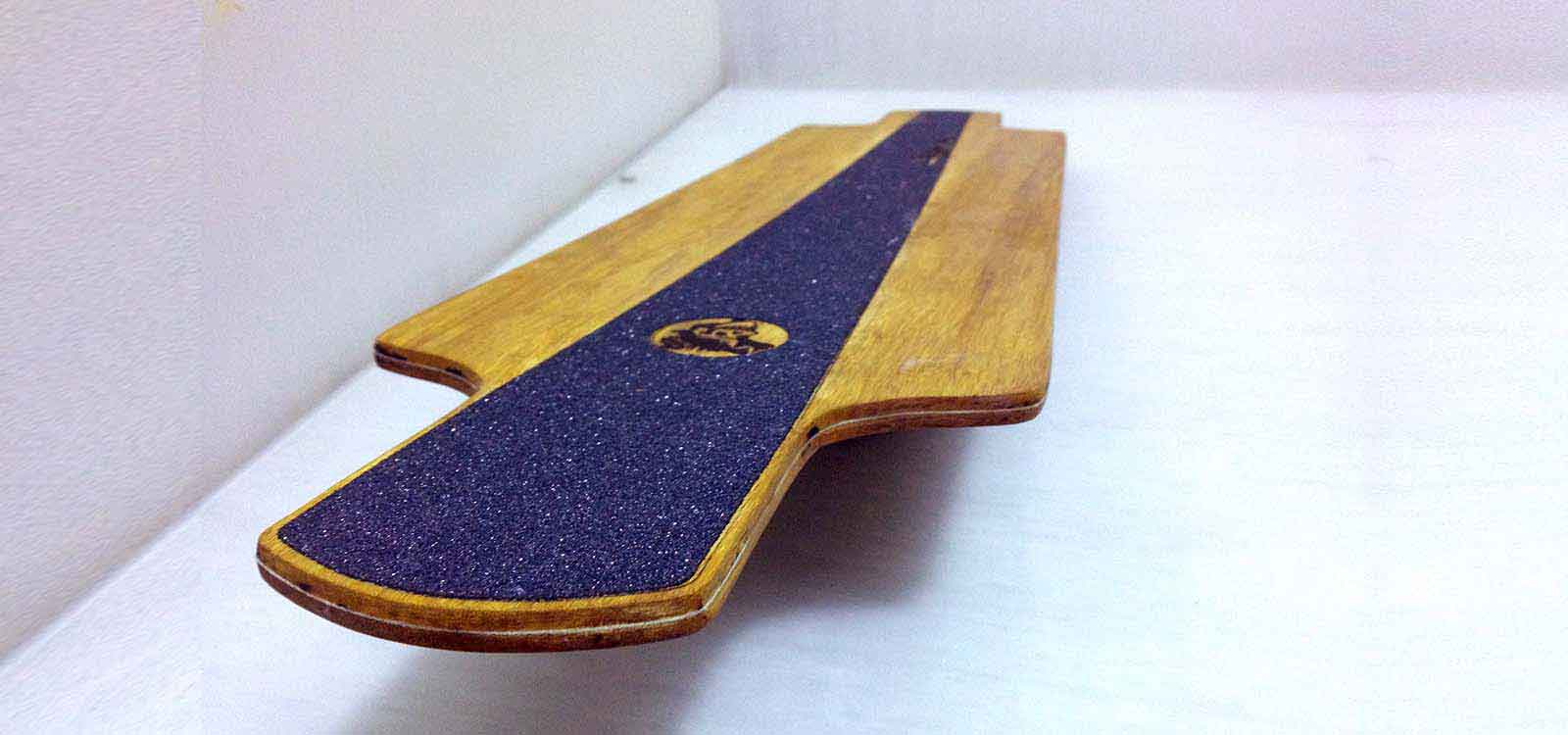 The second step is to cut the shape of the skateboard. The top layer of the skateboard is made of bamboo and I made it 3mm smaller than the bottom layer. In the middle there is a layer of textile that should also be cut in the same shape.