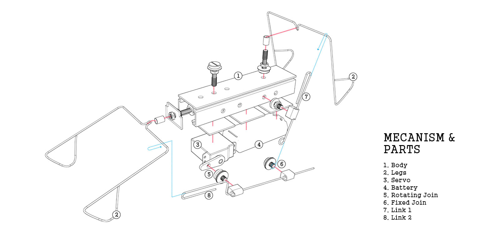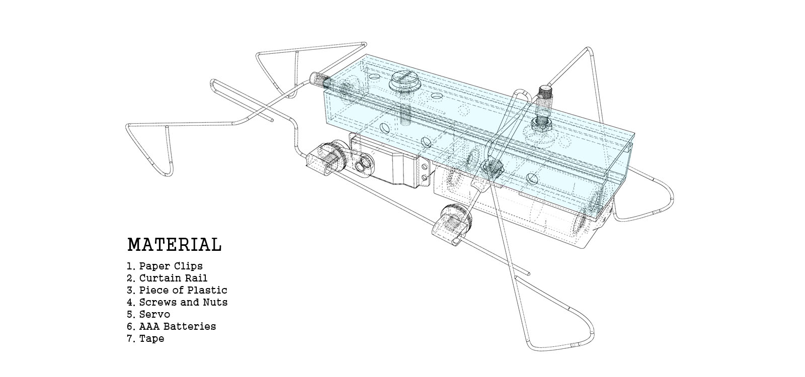 For this exercise I took the robot created by Burhan Saifullah and posted in the webpage "Instructables" . The walking robot works due to a simple mecanism of wire liks connected to its legs, moved by a servo motor. It is made of - among other materials - paper clips, a curtain rail, screws and nuts.