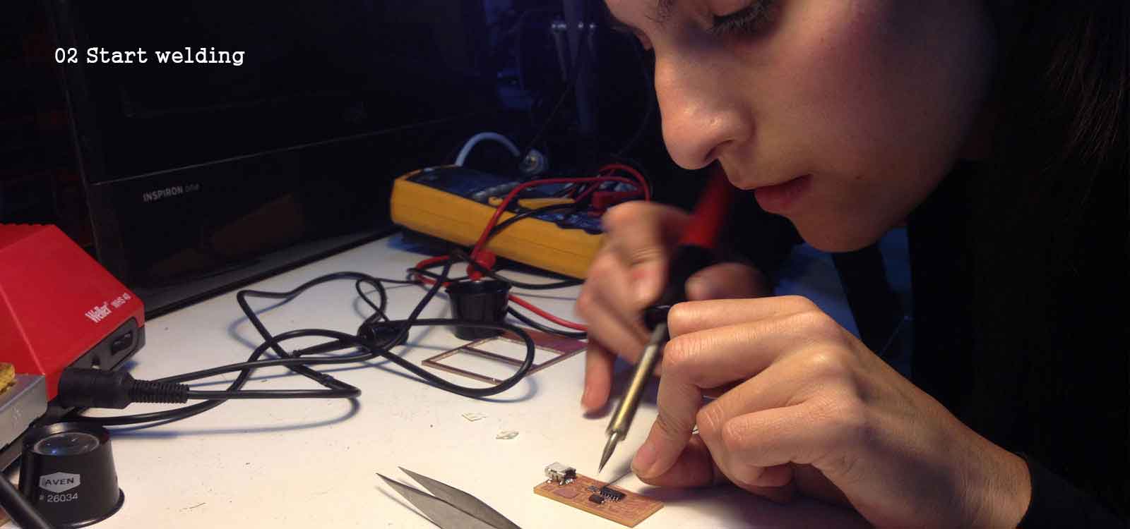 Then I soldered the components. It took me over 2 hourd because I kept melting the sold wire of the pins of the Attiny together. Leo, a classmate, give a very good advice: it is very helpful to heat the spot right where the pin touches the coper and then let the solder wire melt on the pin first and then come down to the board. This way you make sure there is a good connection.
