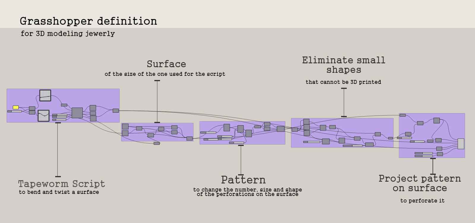 For this week's task, I developed a grasshopper definition based on the MN-tapeworm-script-v002 for designing parametric jewellery [necklaces and rings mainly]. The definition allows to bend a perforated surface in different ways, change its size, lenght and witdh and to also chance the size, number and shape of the perforations. By playing with the sliders you can define the shape you want to later convert it in a mesh to 3D print.