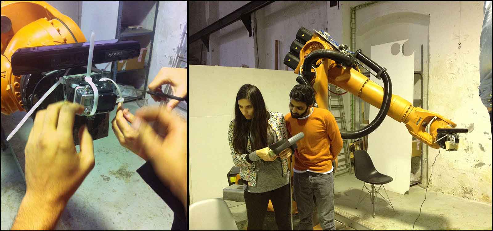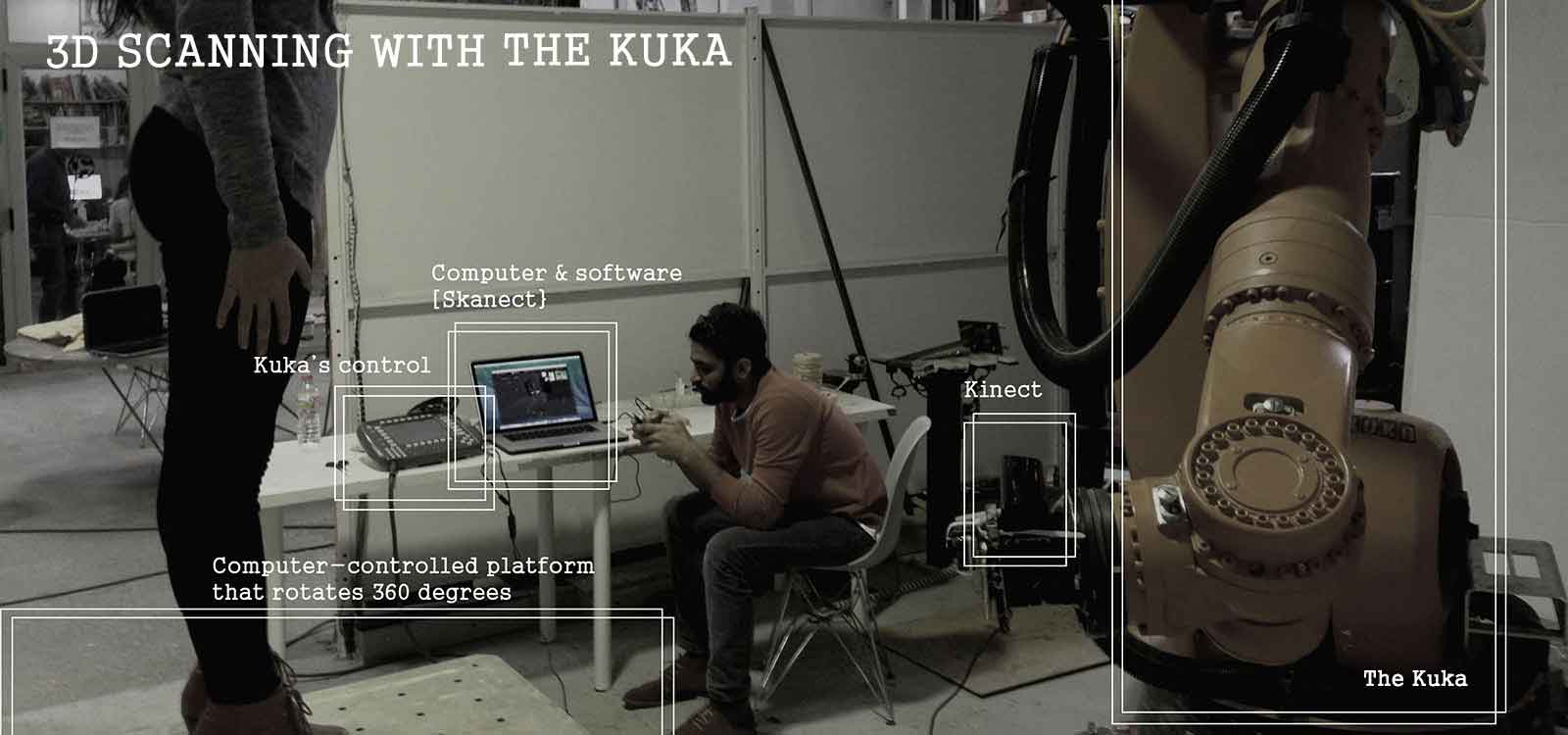 In order to have a very well defined 3D scan, we attached the Kinect to the Kuka. The software used was Skanect. The dynamic was like this: one person stood on the platform, while another one controlled the Kuka and the software. That way we all got the chance to participate in the process