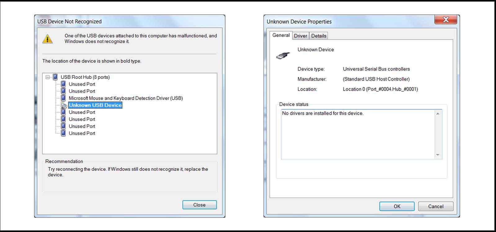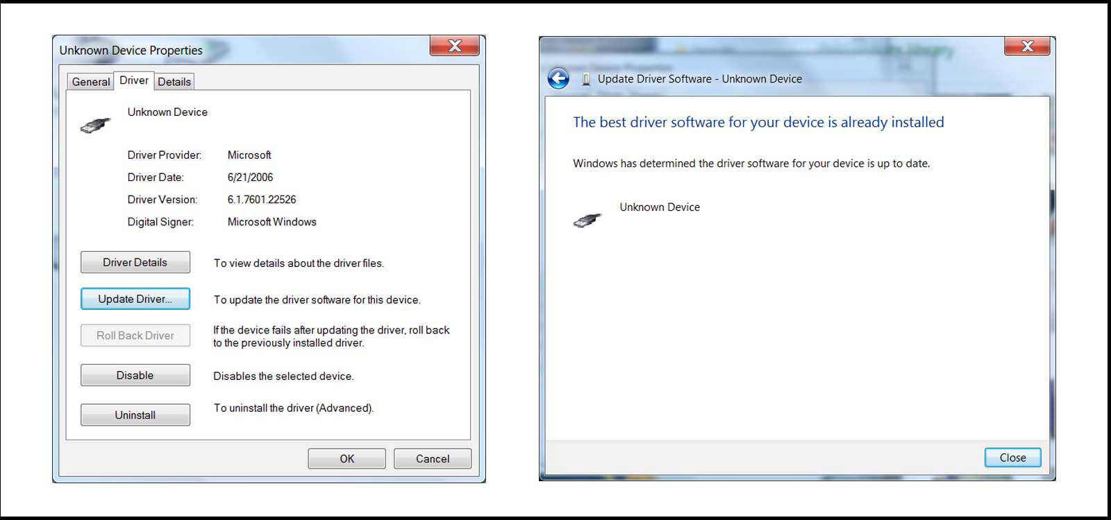 I successfully installed Arduino 1.0 and the board files in windows 7 but the FabISP was recognized as an "Unknown Device" . When I looked at the device properties, I got a message saying "No drivers are installed for this device" so I went and tried to installed them.
