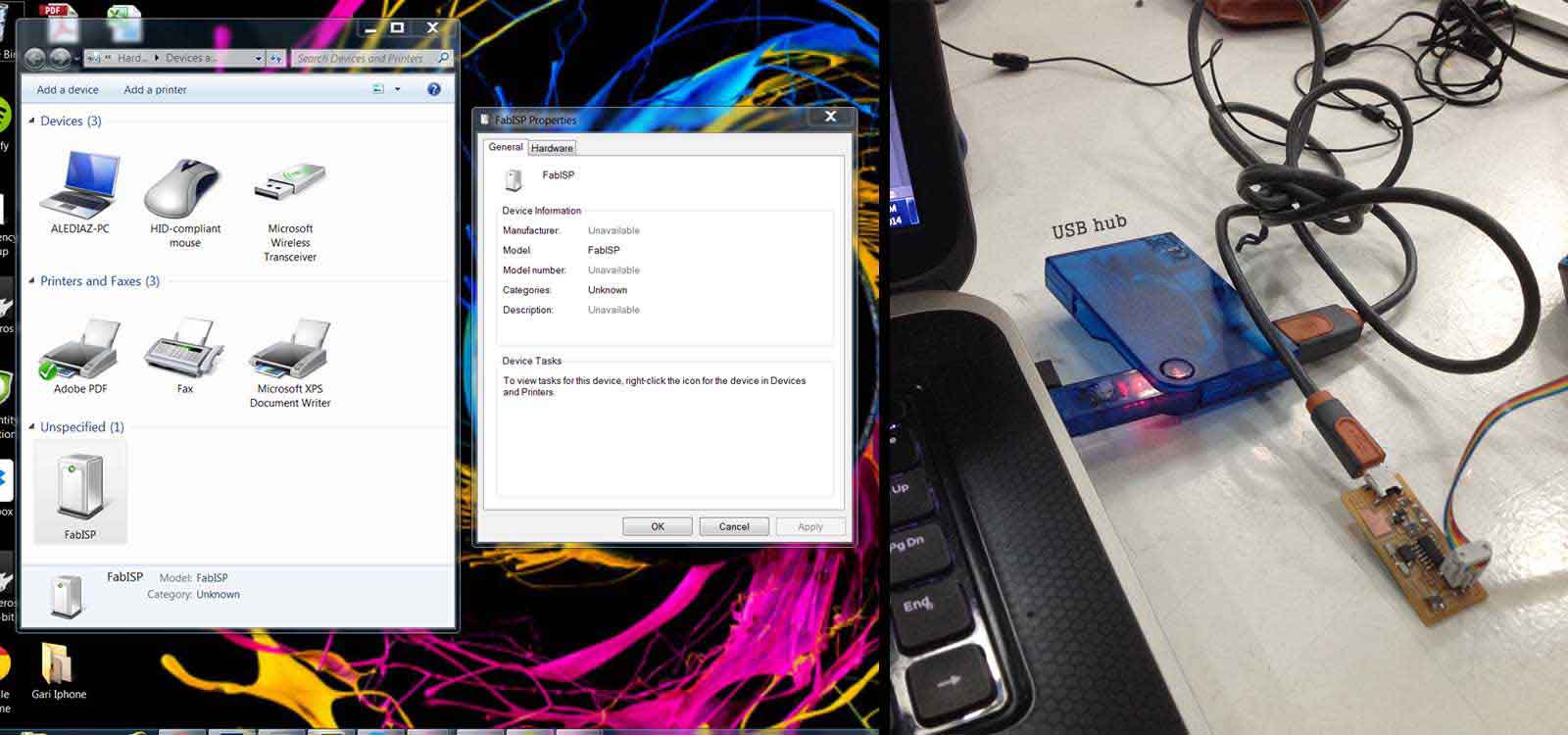 I tried different installation ways, different drivers and with several FabISP to make sure it was not a physicall mistake but I nothing seemed to work. I finally decided to write an e-mail to the FabAcademy2014 group and I got an answer. Our groupmate Francisco suggested to try plugging the board through an USB hub because sometimes the board is not recognized in USB3 ports.That was it!