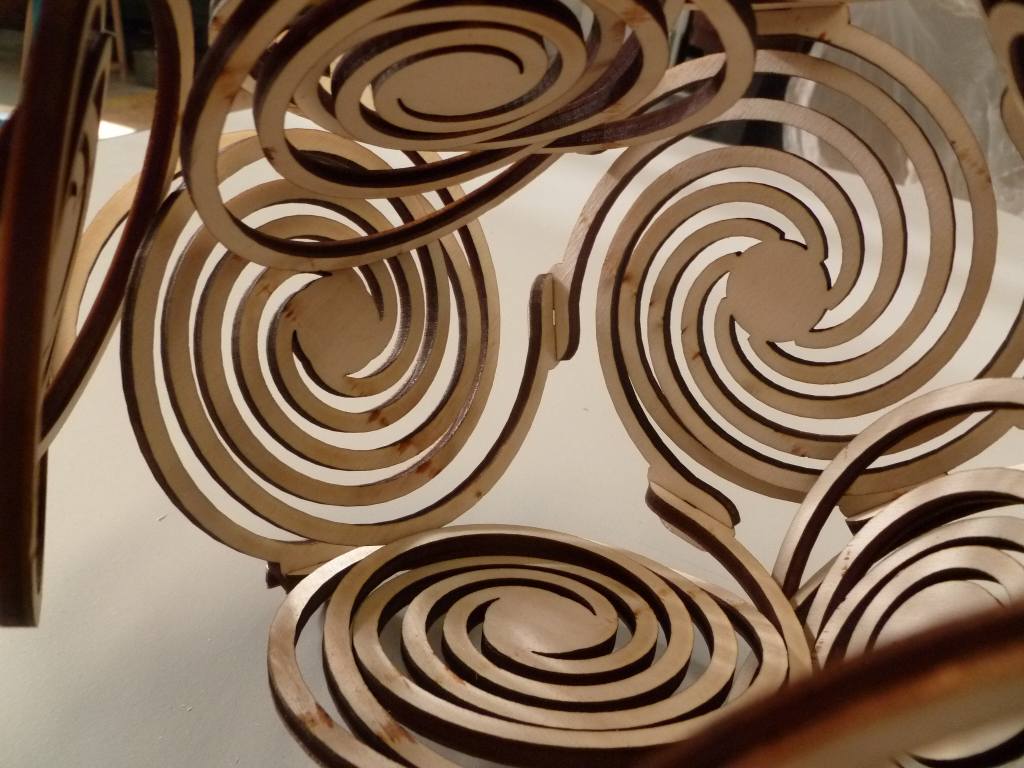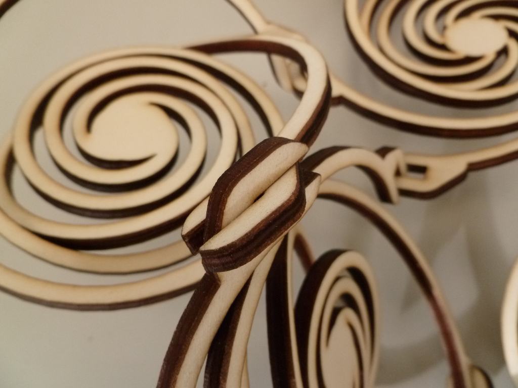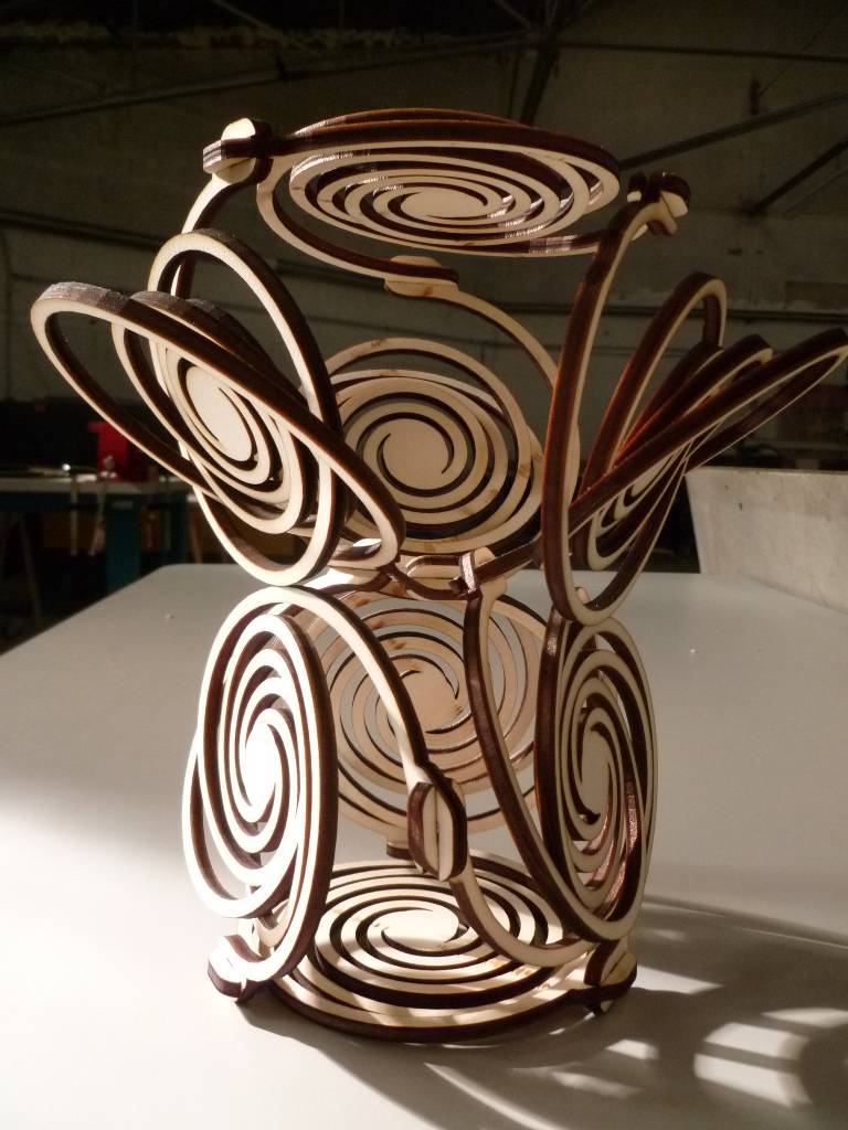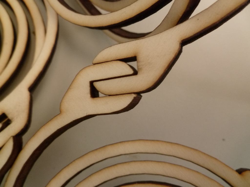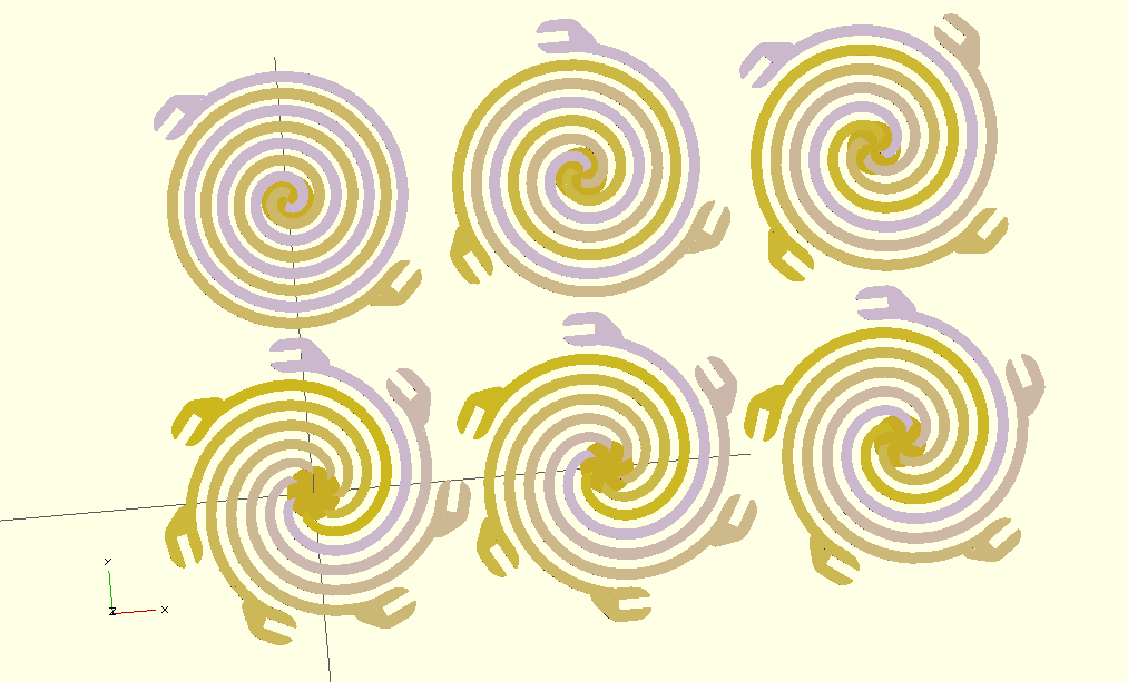 Parametric modelIn spite of inkscape's clone function is usefull, the parametrisation of the all part is difficult with this software. It's why i use openSCAD, secondary to test DXF exports from this software. I used a piece of code of Walter Hsiao on Thingiverse (a spiral generator). This code is CC-NC-BY-SA, so I'll show my code under this license.parametersEach piece draws constant diameter: depending on the number of branches, the number of turns is adjusted in function of the thickness of the branches, and the gap between each branch. So the fewer connectors, and the more the part will be flexible (because branches have a greater number of turns). The final SCAD file is here : spiralfit.scad |