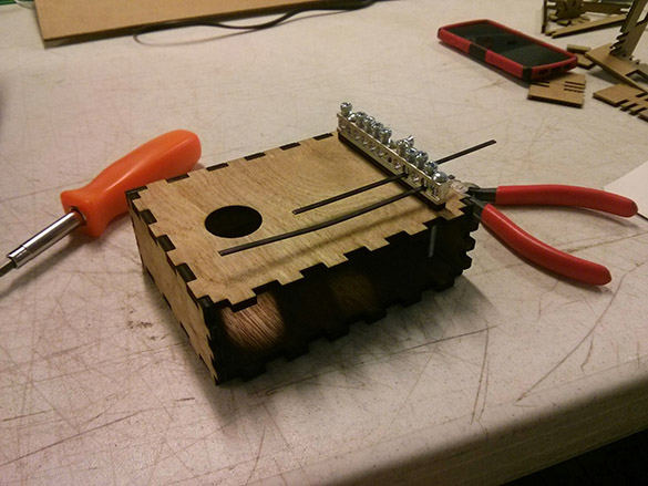 The first two tines went on nicely, and I hoped I could test to see how the kalimba sounded. However, I needed to have the box assembled first, and it seemed like it needed to be on a larger surface to resonate properly and produce louder pitches. So, I finished putting it together, cutting and adding additional tines... and it worked!