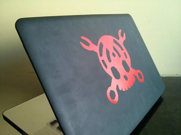 I decided that a fitting tribute would be to make a sticker for my laptop. I removed the gears to get a simpler skull image, and created this .png file. After a few attempts (one of which involved using the wrong transfer material!) and some fiddling to get the curves right, I ended up with this beauty for my laptop (I've got a black case on the laptop and I thought the red sticker was a nice contrast.