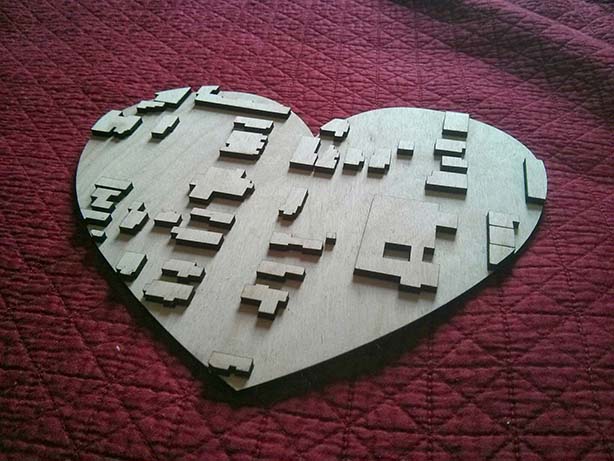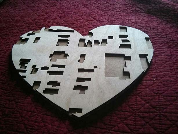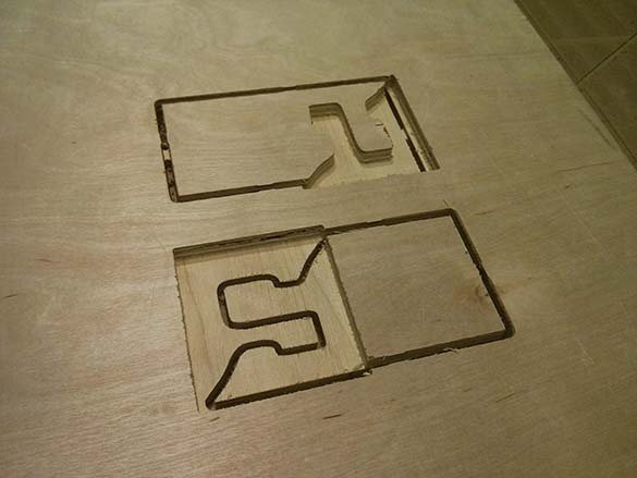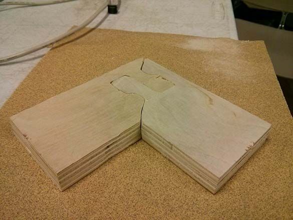 When it came time to put the pieces together, not surprisingly they wouldn't fit (the tolerance wasn't right). I think this was exacerbated by the plywood, as middle layers splintered and made the edges a bit tougher. After sanding for a while, I opted for a more brute force approach and gave a few whacks with a hammer. This worked surprisingly well! However, the top layer of one of the pieces did break a bit as you can see below. I think this would work better with a solid piece of wood instead of plywood.