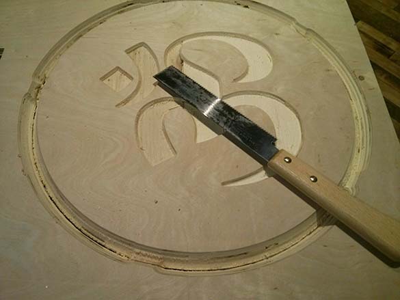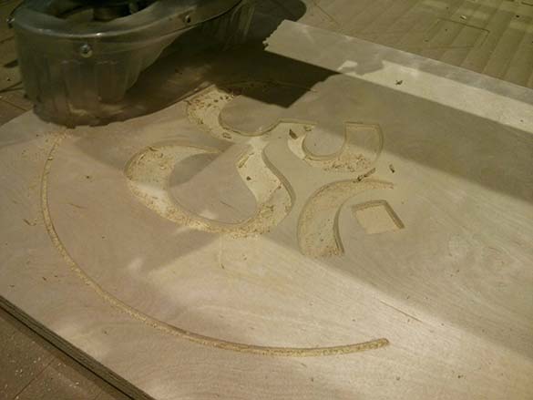 The joint was actually quite strong, and has been holding up well. Next I had a little more time, so I decided to do a quick experiment with the V Cut tool. My wife is studying to become a yoga instructor, so I decided to cut a quick plaque for her. I grabbed an Om svg file, passed it through Inkscape (to convert it to paths), got a pdf, and sent that to VCarve. All told, I was able to go from idea to cutting on the ShopBot in about 20 minutes (it was the end of class), and things went very smoothly. One point I had wanted to test in particular was tabs with the V cut bit. Rob had made a plaque earlier in the night, and the tabs from the V Cut bit were applied throughout the piece, leaving these extra large lumps on the side. Shawn had suggested making two toolpaths, the first one would be 75% pocket and then the final profile cut would include tabs but they would only hit the bottom 25% of the wood.