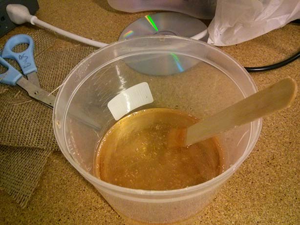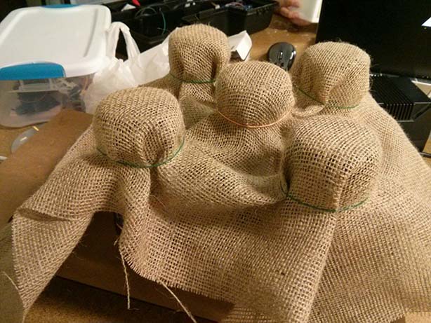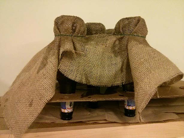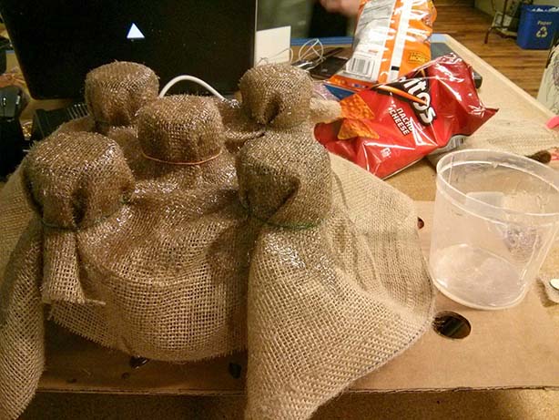The burlap wouldn't form around the bottles tightly enough with just gravity, so I grabbed some rubber bands to fix it in place. Nick warned me that they would be stuck in the composite (he had tried the same thing with a zip tie), but that was OK with me and adds a touch of color. In retrospect I should have precut the handles in the burlap to make this an easy bag assembly.