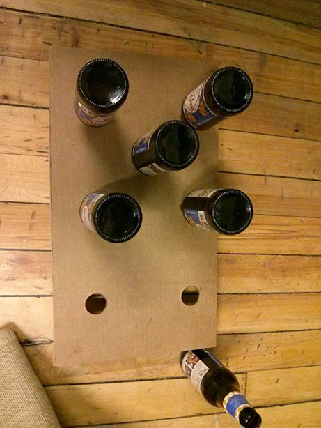 I got started by cutting a jig out of cardboard for 6 bottles, but then realized that I had spaced them too far apart, so modified the design to work with just five.