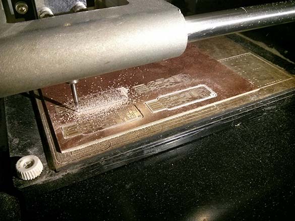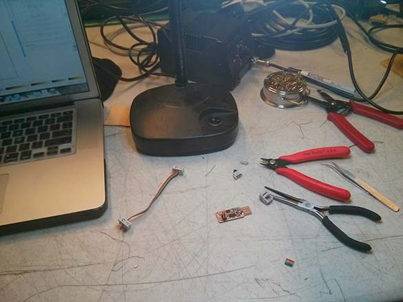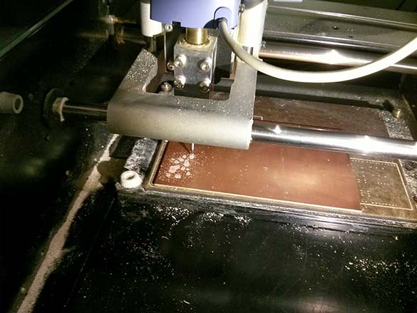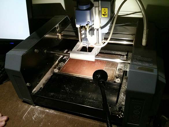 Our first attempt seemed to leave some tiny bits of copper between traces. We increased the number of paths, and some students tried decreasing the z on the Fab modules to increase the cut depth. Varying success here, and we eventually just had to remove little bits with an exacto knife afterwards. Good lesson in post-production board editing I guess.