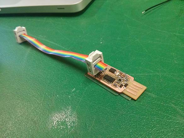 Our design required a shim for a snug fit in my laptop, so I laser cut a batch of shims using some thing acrylic. This seemed to work well, although for the time being it's left unattached to the FabISP itself. After testing the FabISP with Shawn, I cut out a cable for it, and tried programming an Arduino.
