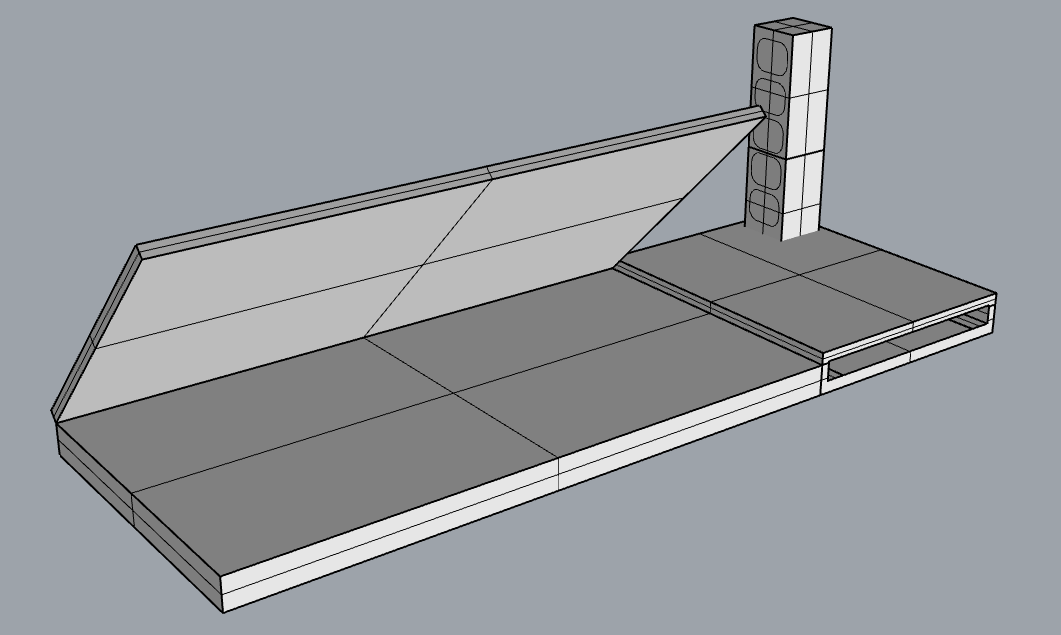 I rushed into working/playing/learning Rhino and didn't have a clear idea sketched out on paper beforehand. This meant that my first model was not well measured or snapped to the grid properly. However, the model I made does convey the basic idea of having a desktop that can flip up, a retractable power supply with a laptop dock built in below on the right side. Here is a picture of the very first design: