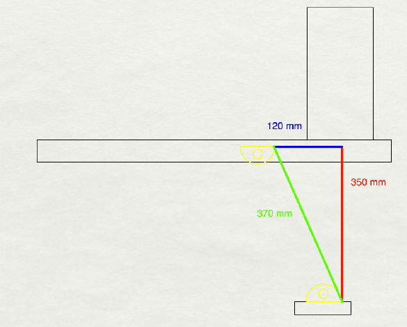 My second attempt is my current working model. This time I made sure to set up snap to grid properly, and got as far as beginning to design the attachments for connecting the pneumatic(?) arm supports that will allow the desktop to raise/lower. I've highlighted these in the image below. There is also the beginning of a support rectangle for the monitor(s) to sit on. The dimensions of these parts are somewhat speculative for the time being as I don't have access to the monitor I'm using right now.