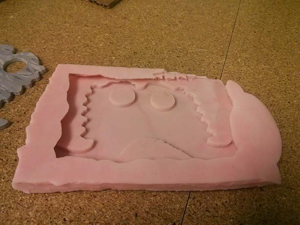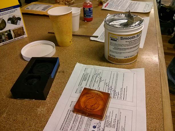 We had some left over silicone mixed, so we decided to experiment with Shawn's tile experiment from the shopbot. Since we were on a tight schedule