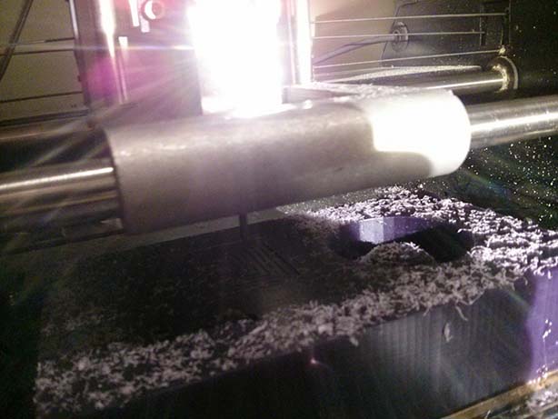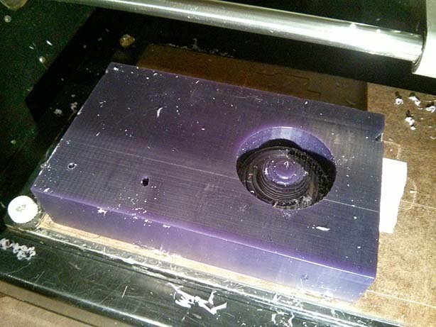Eventually, I ended up simplifying my graphic and trying the whole thing on a 1/64th inch bit pass. This was going to take upwards of 12 hours, so I had to leave the machine running and hope for the best. Since I had already started and stopped 3 or 4 times by this point (and it was already about 12 AM) I decided to leave the machine running over empty space where it had already cut and hope for the best. I was a little concerned because I could see that part of my mold would be very close to the edge of the block, but I decided that this would probably help make things easier to remove.