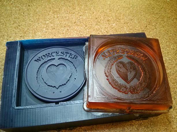 The next day, I got an email from Shawn telling me that it looked like the job had finished. Surprisingly enough, the mold looked great! We didn't have the food safe silicone yet, so I decided to make a first attempt with the available materials. It's very important to stir with a shearing motion rather than spinning, as this can introduce bubbles. I noticed as I poured the mold, that even though I had reduced my details, I still seemed to get bubbles around some of the letters. I poured in a single location at the lowest point of the mold, but I think that the cavities for the letters were so small that air pockets were left at the bottom of the E's, and the serif points of the C, and the small detached sections of the S and the R. Even so, I was satisfied with the results!