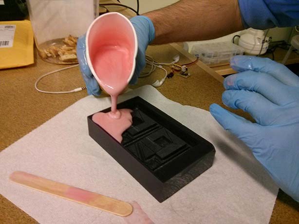 Next week the food safe silicone had come in, so I teamed up with Damian (who was also making a chocolate mold), and we repoured after mixing up a new batch of silicone (which seemed to take forever). I actually don't have any pictures of my mold, since I was pouring it, but I did get a shot of Damian pouring his QCC chocolate mold.